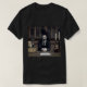 A t-shirt depicting a scary character looking right into the camera, sitting behind a desk in a mediaeval office with dark fantasy and gothic attributes, like a skull and mediaeval books. Concept of signing a contract with a demon.