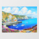 "Devon Harbour Dreamscape" – An English Seascape. A stylised watercolour of a radiant coastal vision where rolling green hills meet the sparkling blue waters of a peaceful harbour. Boats rest at anchor while whitewashed cottages with ochre roofs nestle against the landscape. Clouds bloom overhead like painted sculptures, and bright flowers in the foreground add vibrancy, creating a dreamlike celebration of the English seaside.