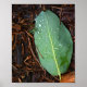 A lone green leaf sits on mulch, dappled with dew drops. Send some natural calm to someone today!