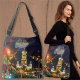 It's very roomy. The fabric is soft and flexible, and the strap is wide and adjustable to fit across the body. The printing is true to the photo.