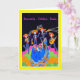 Day of the Dead, Dia de los Muertos, paper greeting card with a dancing Catrina figure surrounded by skeleton musicians. Remember, Celebrate, Dance written in Spanish on the cover. The inside message translates as: "Memories keep us alive." Art, image, and verse copyright © Shoaff Ballanger Studios, 2022.