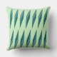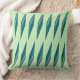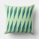 The throw pillow artwork features a pattern of cyan-hued, elongated, diamond shapes arranged in a gradient, illusionary, and three-dimensional grid-like formation against a fresh pastel tea-green canvas.