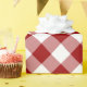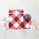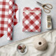Homey wrapping paper features dark red, white, and light red squares in a bold diagonal buffalo plaid. The red and white gingham pattern is perfect for Christmas and other occasions.