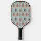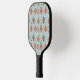 This pickleball paddle has a mid-century modern design of solid diamonds overlapping and repeating across the design, as well as diamond outlines repeating across the design in shades of orange, grey-green, dark blue. If you like the design but prefer different colours, message me.