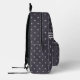 This backpack features a dusty plum purple scripted name on a pale pink grey Deco style band above the pouch over a diamond pattern on dusty plum purple with diamond florets at the intersections.