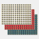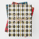 Wrapping paper that can be used for the holidays and throughout the year. Patter features black and gold diamonds with a gold grid on white, blue and red backgrounds.