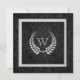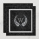 Monogram in a diamond laurel leaf pattern on black damask.