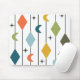This mouse pad has a mid-century modern design of vertical lines with diamonds and boomerangs, with starbursts scattered in the background.