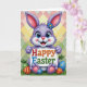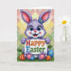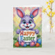 This card features a purple bunny centered in the scene, standing upright with big blue eyes, rosy cheeks, and a small pink nose that gives it a sweet, friendly look 🐰. A tiny blue flower sits near the top of one tall ear, and the bunny’s gentle posture feels like it’s offering a greeting to someone it cares about. It holds a bright white sign across its body, with “Happy Easter” placed in the middle in multi-colored letters that stand out clearly. The background is filled with pastel diamond shapes in peach, yellow, and soft green, arranged like a cozy patchwork pattern. Along the bottom edge, green grass rises in soft tufts, creating a springtime base for the scene 🌷. Nestled in the grass are decorated eggs in red, blue, and green, each covered with small stripes, dots, and little flower-like details. The lettering sits centered on the sign, while the bunny’s pink-lined ears and the pastel diamond backdrop frame the composition with gentle contrast.