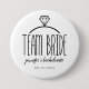 Team bride button in white with charming black text and an illustration of a diamond engagement ring. Personalise with the bride's name (or the wearer's name) and the date of the event.