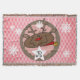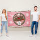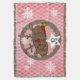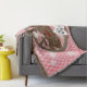 Beautiful Christmas holiday throw blanket features a cute red nosed reindeer on a background of pink diamonds, a strip of solid brown, and a pink centre with white polka dots and snowflakes.