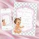 Diamonds and pearl baby shower invitation with adorable baby girl wearing pink ruffle pants and string of pearls on a beautiful tufted diamond background with pretty silver and pink bow background. This adorable pink and grey diamonds and pearl baby shower invitation is easily customised for your event by simply adding your details in the font style and wording of your choice. This is a printed design with no real diamonds, pearls, tufting, glitter, etc.