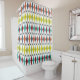 This shower curtain has a mid-century modern design of stretched diamonds and starbursts on a field of white.