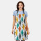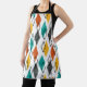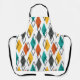 This apron has a mid-century modern design of diamonds scattered about in orange, gold, turquoise, gray, and outlines on a field of white