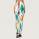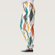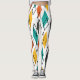 These leggings have a mid-century modern design of diamonds in orange, yellow, turquoise, grey, and outlined scattered throughout on a field of white.