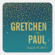 A stylish, modern square sticker features glittery flecks of golden square confetti spilling onto the body of this turquoise sticker. Matching products available. Comes in 6 colours: aubergine, navy, turquoise, black, pink and sand. Click the CUSTOMIZE IT button to personalise with your own text. TO SEE THE ENTIRE COLLECTION, VISIT MY WEBSITE: glamprettyweddings.com. For questions or custom requests, email: cheryl@glamprettyweddings.com/contact. "Diamonds in the Sky" design by Cheryl Daniels © 2014.