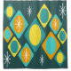 An atomic age mid century modern 1950s era abstract art with starbursts in ovals in rounded diamonds. Colourful, dark teal, yellow, orange, multicolored.