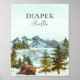 For the Diaper raffle table at your baby shower. This design has rustic, watercolor mountains with reflecting lake in front, and pine trees surrounding the lake. Adult bear with her cub in front. “Diaper Raffle” text at top.