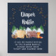 Sweet rustic baby shower diaper raffle drop off poster sign featuring a cute illustration of woodland animals with their tent camping under a dark blue starry night sky in the mountains and forest, and "Diaper Raffle" in a white script.