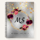 A faux silver metallic looking background with dripping faux golden stars. Decorated with a faux gold geometric frame and burgundy, pink and rose gold coloured flowers, florals. Personalise and add your monogram letters, initials and a title. Black coloured letters. Can be used as a diary, taking notes, to-do lists.