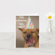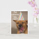 Sophie the mixed breed dog wearing a birthday hat and licking her lips. "Did someone say cake?"