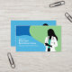 A business card design featuring a silhouette of a woman with long hair, wearing a white coat and a stethoscope around her neck, and she has a notepad in her hand. The background is blue and green.