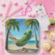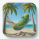 Big green dill pickle hanging between two tropical palm trees on a beach with flip-flops.