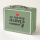 This is a standard metal lunchbox that appears to work just fine. We designed this box ourselves with an uploaded photo and custom text on the front and back. It looks absolutely beautiful except the front of the lunchbox is not centered like it shows in the photo. The print borders don't align with the inset flat part of the box where the preview photo online showed it perfectly centered in there. The back looks nice and centered though.