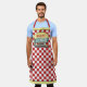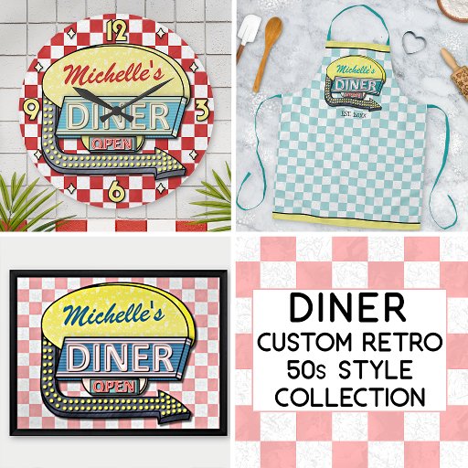 Create your own personalised, 1950's style diner sign apron using this simple template. This cool retro kitchen art has a slightly distressed red-and-white chequered background with a sign on top that says "DINER" and "OPEN" in neon with space for you to add your own first or last name. The sign also has a (faux) lighted arrow graphic. The colour scheme is red, white, yellow, and teal blue with some grey and black. This cute apron is perfect for anyone with a 50s-themed kitchen. Just fill in the easy DIY template or "Customise Further" if you need to resize, rearrange or change text colours & fonts. DESIGN TIPS: You can also resize the checkers and resize / move / remove / recolor the yellow and black borders.