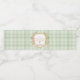This water bottle label has a watercolor image of a crest surrounded by floral branches with green and pink gingham pickleball paddles in the centre. Text says "Dinks and Drinks." Colours used include moss green, blush pink and and tan.