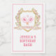 This wine label has a watercolor image of a crest surrounded by floral branches with green and pink gingham pickleball paddles in the centre. Text says "Dinks and Drinks." Colours used include moss green, blush pink and and tan. You can personalise with a name and birthday year.