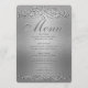This modern and sophisticated elegant silver shimmer ornamental dinner menu can be customised. You can change the font and colours of most of the text and change the background colour to different shades of shimmer. Designed by Amelia Carrie and sold exclusively through GlitterInvitations.com Note: This is a graphic print reproduction or artwork and contains no messy glitter. #silvermenu #elegantmenu #weddingmenu