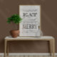 Elegant vintage Victorian style poster for kitchen, bar, cafe or restaurant. The words read "Eat Drink and Be Merry!" The white background colour is customisable.