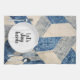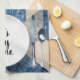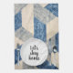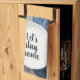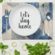 White dinner plate with silverware on blue and ivory abstract pattern and "let's stay home" text.