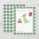 Watercolor kids birthday party. Watercolor Dino in birthday hat, cake with candles, red balloon. Green cage background.