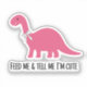 A simplistic, pink silhouette of a dinosaur against a white background. The dinosaur is adorned with a ribbon tied around its neck. Below the dinosaur, there's a textual element that reads 'feed me & tell me i'm cute'.