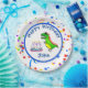 Fun dinosaur themed birthday party design features a background of confetti a various colours such as red, blue, orange, and green. There is a solid white circle with blue trim in the centre. Inside the circle is a hand drawn graphic of a green tyrannosaurus rex standing next to a birthday cake. Above the t-rex and birthday cake is text in blue font that says Happy Birthday. Below the cake and dinosaur is customisable text in same blue font where you can customise with the birthday boy or girl's name. Matching Dino-Mite Time Dinosaur and Cake Birthday Party Invitations also available!