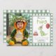 Watercolor kids birthday party. Watercolor Dino in birthday hat, cake with candles, red balloon. Green cage background.