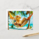 Lazy dinosaur relaxing in a hammock between palm trees. A calm and funny prehistoric beach moment.
