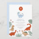 Dinosaur 1st Birthday Party Invitation features a pastel blue dinosaur holding a red balloon with the number 1 inside of the ballon in a colourful, fun dinosaur themed setting. Customise it with your child's age, name and party details.