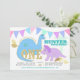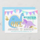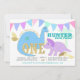 Polka dot brontosaurus and purple triceratops, adorable dinosaur themed first birthday party with decorative pastel pennant flag bunting and gold colour accents. Baby's first birthday party invitation with cute dinosaurs for boys or girls.