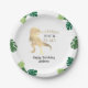 Funny dinosaur 4th birthday party paper plate with gold watercolor tyrannosaurus rex and green leaves. Personalise it with your event details. Great for a prehistoric bday party. Unisex design for boy or girl.