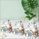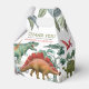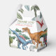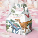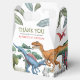 Kids birthday thank you party favour boxes featuring a simple plain white background, jungle green foliage, a collection of watercolor dinosaurs, and a thank you template that is easy to customise.