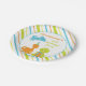 This cute dinosaur paper plate has an orange, green, and blue stripes edge with a white centre.  There are two dinosaurs at the bottom with a blue flying dino to the left.  On the right, you can easily customise the text!