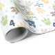 Personalised wrapping paper for 1st or any Birthday of a little boy featuring colourful dinosaurs and doodle dinosaur footprints in blue, green, beige and yellow. Easily personalise all the text or leave some of it blank. - Kate Eden Art