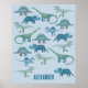 Lots of blue dinosaurs, Tyrannosaurus rex, Spinosaurus, Stegosaurus, Diplodocus and Triceratops on a mid blue background. Change the name to personalise.