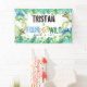 Birthday party banner for a dinosaur themed birthday party with dinosaurs and tropical greenery background.