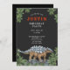 A dinosaur birthday boy's birthday party invitation featuring a dinosaur walking surrounded by primeval palm leaves. A scene from the dawn of time, with coloured typography in green red and white on a black background. Black on the back of the invite.