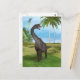 3D digital render of a dinosaur Brachiosaurus on background of blue sky and green palm trees
