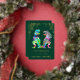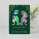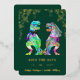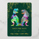 Introducing the perfect way to add a playful touch to your big day. Dinosaur Themed Wedding T-Rex Bride and Groom gold foil Save the Date Invitation. Featuring vibrant watercolor illustrations of a charming T-Rex bride and groom, this save the date wedding invitation is sure to bring smiles to your guests' faces. Gold foil script and modern typography and eucalyptus leaf foliage gold foil detailing, combines fun and elegance in one delightful design on a striking dark emerald green background.